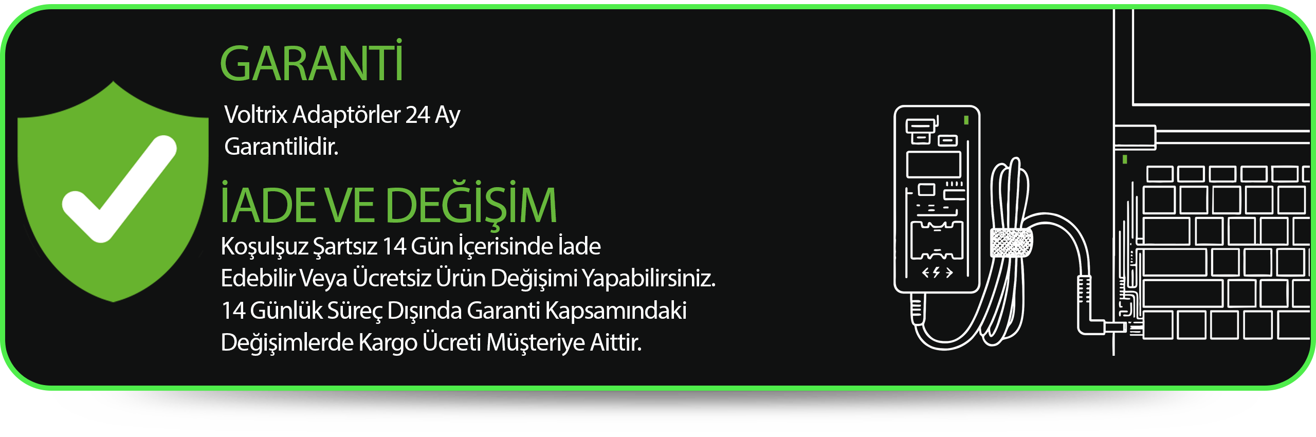 Her zaman güvenilir ve dayanıklı enerji çözümleri sunuyoruz. Kalitemizden ödün vermeden, yüksek standartlarda üretilmiş komponentler ve parçalar kullanarak sizlere mükemmel performans ve uzun ömür vadediyoruz. Güçlü ve sağlam tasarımlarımızla sizleri asla yarı yolda bırakmıyoruz. Notebookunuzun gücüne güç katmak için bize güvenin! #GüvenilirEnerji #KaliteBizimİşimiz #VoltrixAdaptör